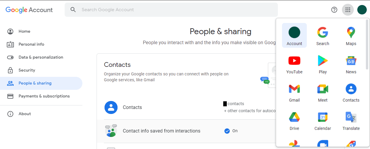Para evitar que los detalles de contacto se agreguen automáticamente a sus contactos de Google, debe ir a la configuración de su cuenta de Google. Para hacer esto, haga clic en el ícono de nueve puntos en la parte superior derecha de la mayoría de las páginas de Google, luego haga clic en la opción "Cuenta" en la parte superior izquierda. En la página de la cuenta, vaya a la pestaña "Personas y uso compartido", luego haga clic en "Información de contacto guardada de las interacciones".